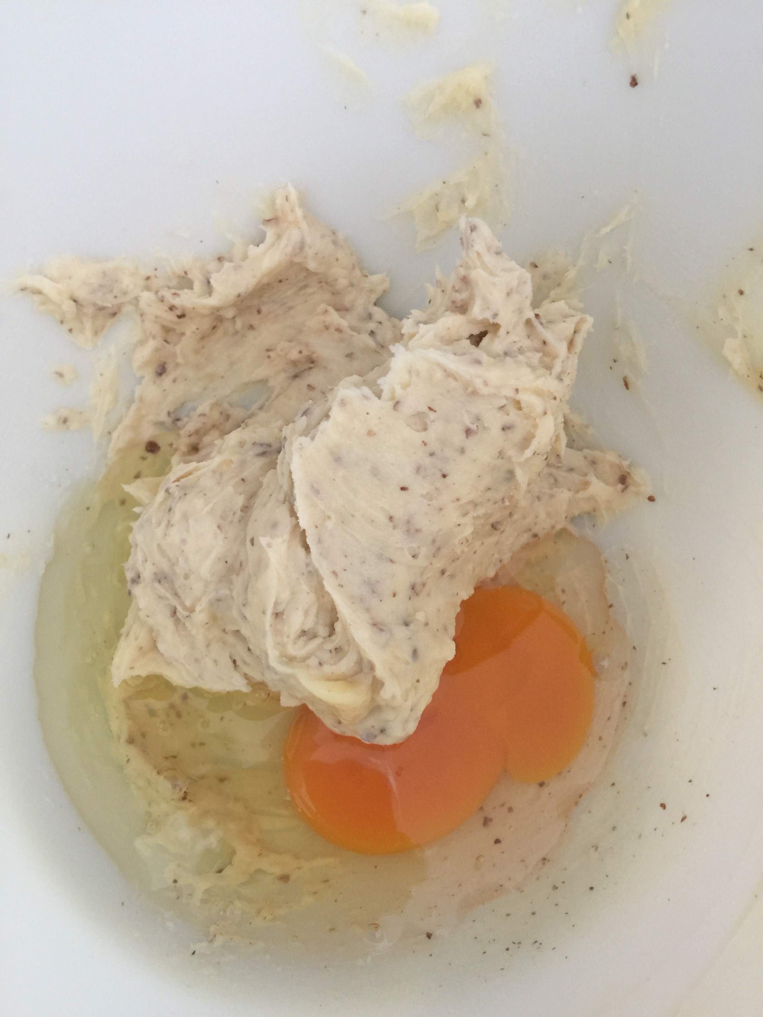 Ajouter 50gr d’œuf et mélanger jusqu’à ce que la masse soit bien homogène.(cela prend bien quelques minutes).
